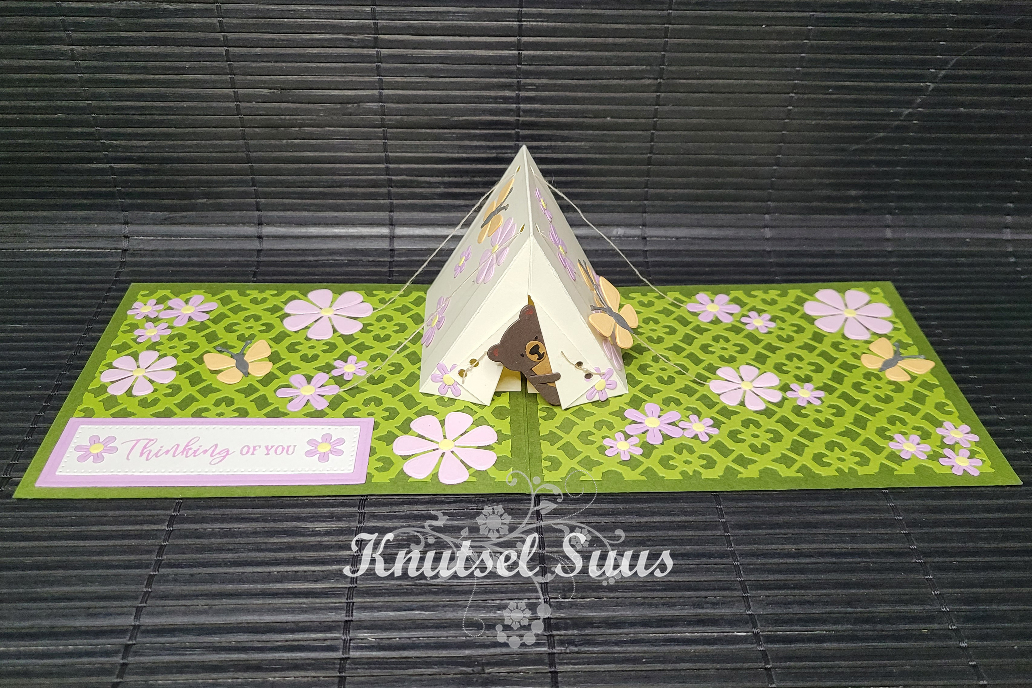 Suzanne Smit made a sweet Tent Pop-up card for a sad reason. It is a sympathy card for a scout mother. I love how Suzanne honored her love of camping while also incorporating beautiful flowers and butterflies. The peeking bear and pattern plate background is perfection. I'm sure this card will bring comfort in a time of grief. Click over to Suzanne's blog to see the card front.