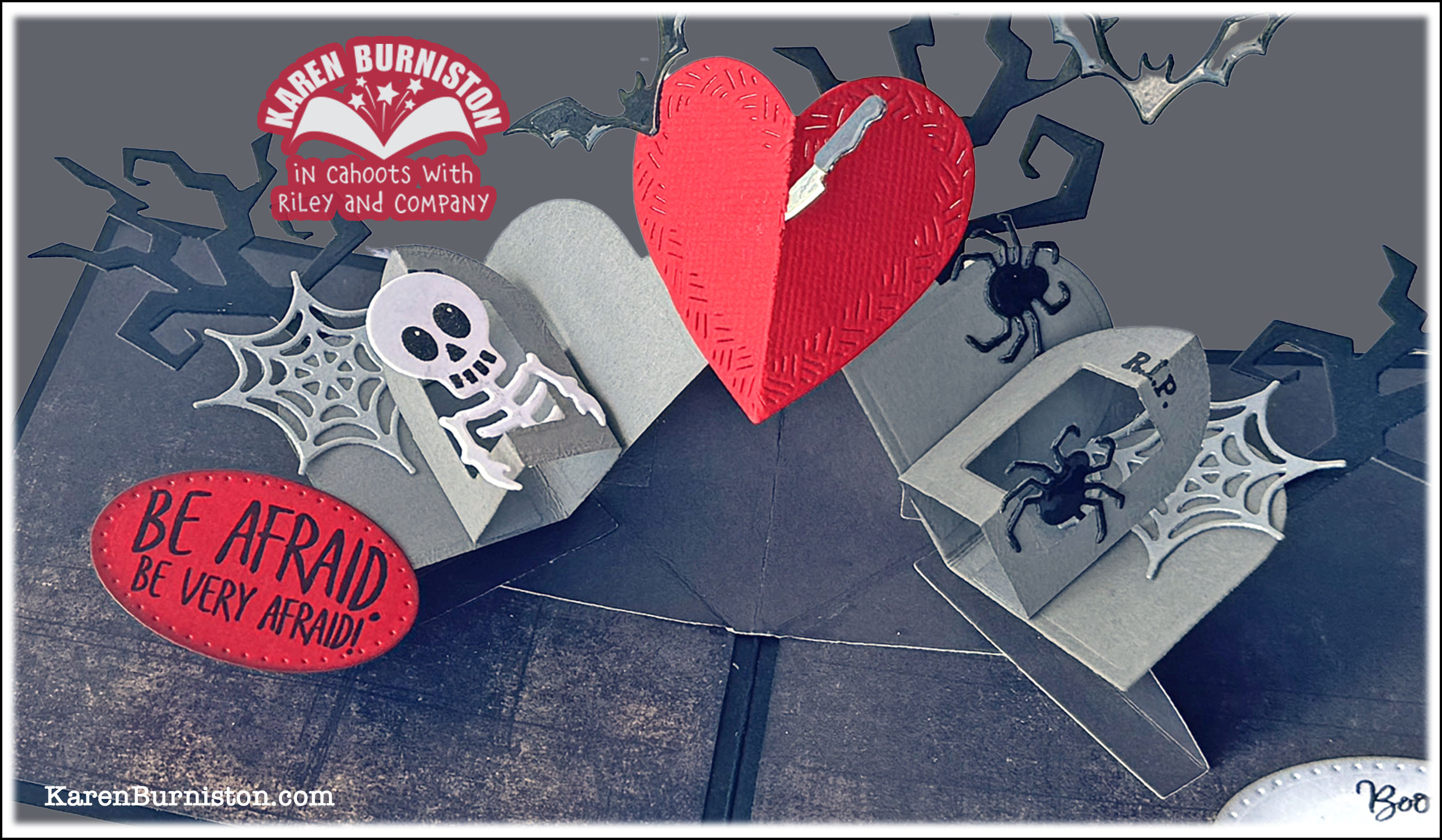Inside a dark and eerie scene is revealed. To match the theme I created peek-a-boo window tombstones on each side of the pop-up. A tell tale heart from the Hearts-Crosshatch set is used in the center of the pop-up. To add the face to the Skeleton I used the new Fun Faces 1 Clear Stamp set, which offers a quick way to add faces to our animal and character dies rather than stenciling. And just to really set the macabre tone of the card I pierced the tell tale heart with a knife from the Oven Extras set.