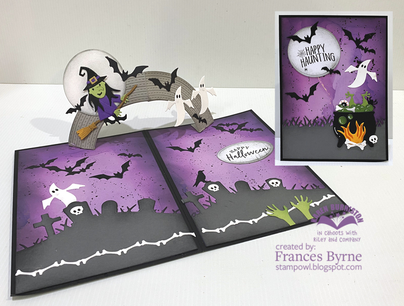 Frances Byrne combined the Arch Pop-up with the Rainbow Add-ons, cut in all gray, to make a wonderful Halloween scene with flying witch. The details are fabulous, including that haunting purple background. Click over for more details on this great fright night card!