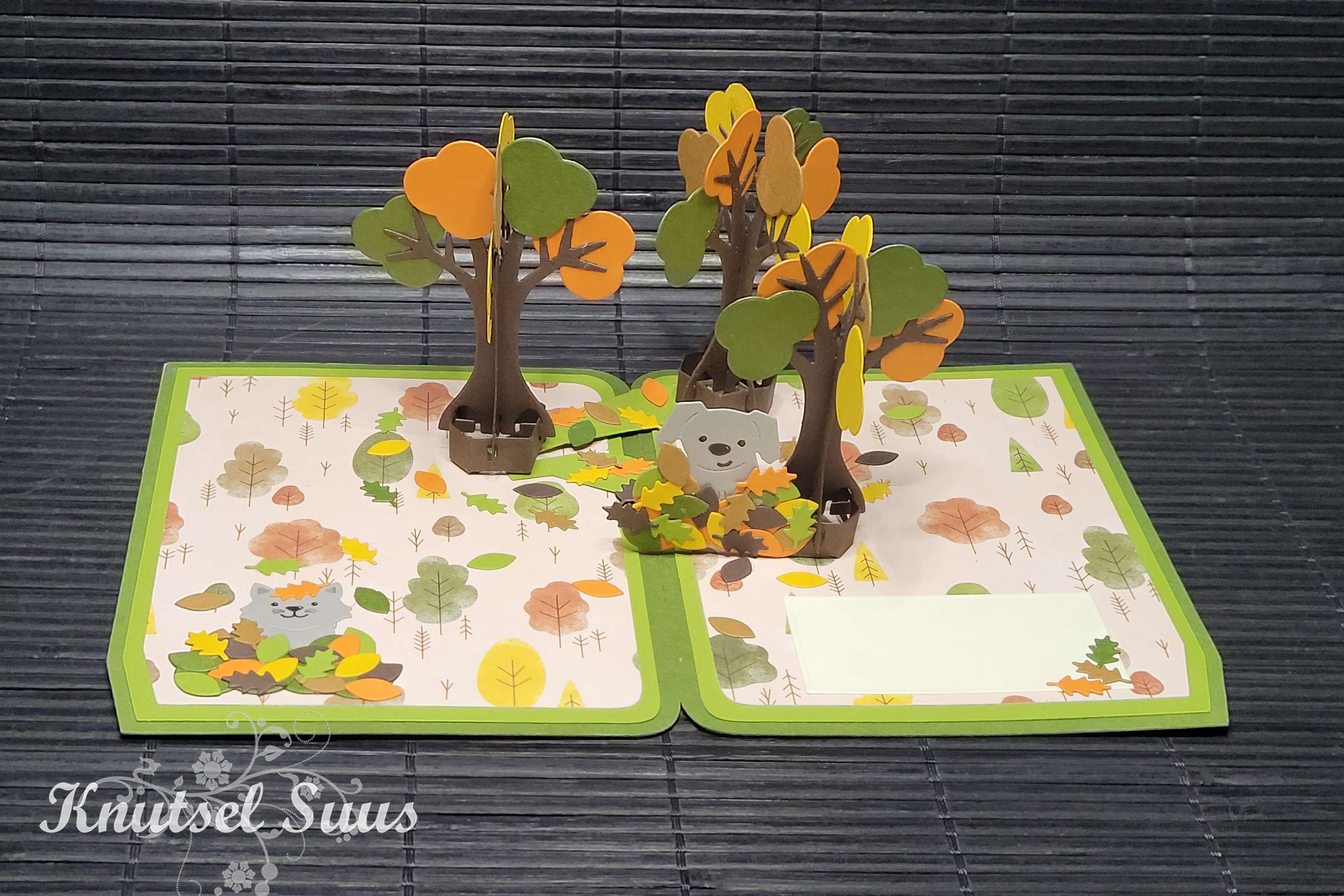 Suzanne Smit celebrates autumn with a great Tiny Trees card featuring the Cat and Dog dies frolicking in the leaves. I love the unique shape to Suzanne's card. Be sure to click over to see the front of the card.