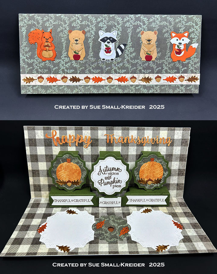 Sue Small-Kreider made an autumn-themed slimline card featuring Woodland and Winter Animals on the front, each with their respective fun faces. I adore the border Sue created with small leaves and acorns. Click over to Sue's blog for a process video on this card.