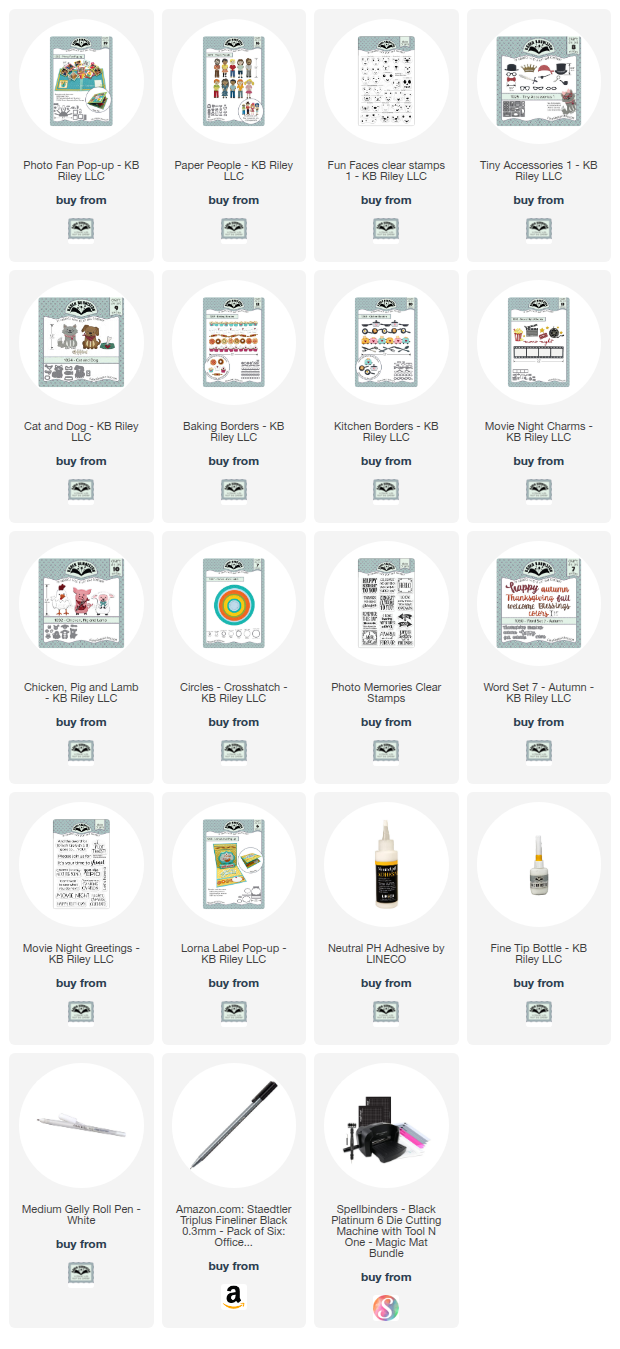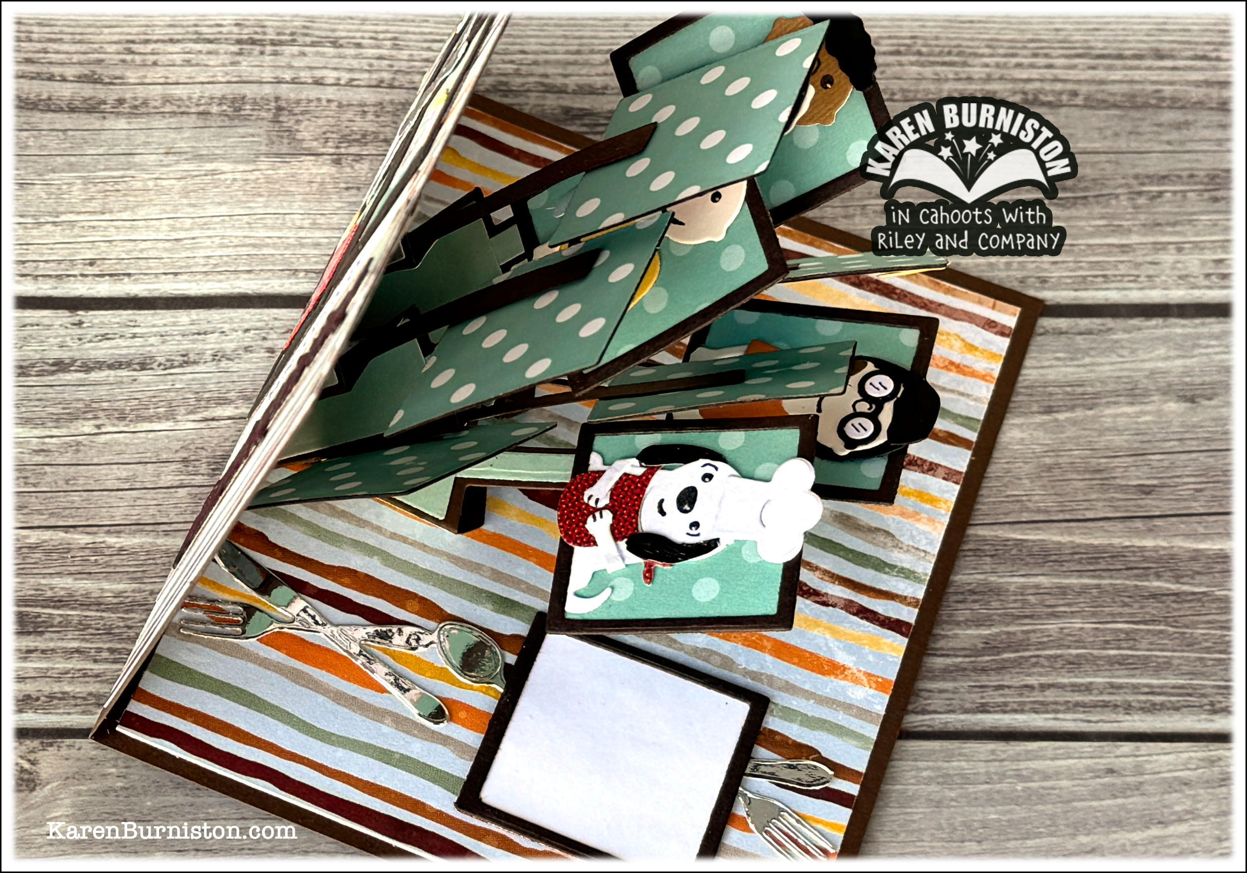 Inside a double Photo Fan pops up, revealing all the characters from the animated special. I combined the Paper People, Fun Faces 1 Clear Stamps, Cat and Dog, Tiny Accessories 1, Baking Borders, Chicken, Pig and Lamb, Circles - Crosshatch, Kitchen Borders, Movie Night Charms and Photo Memories Clear Stamps plus a white gel pen and a black pen.